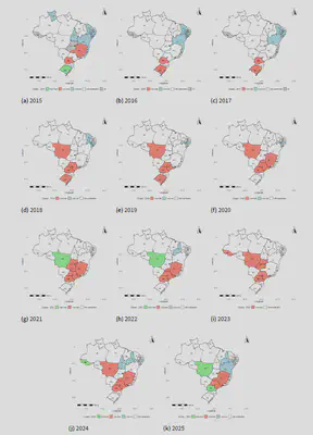 For female victimization (Figure 1), the results reveal a persistent and geographically coherent pattern of spatial clustering over time. High-High (HH) clusters — representing spatial concentrations of elevated rates surrounded by similarly high values — are predominantly located in the North and Central-West regions. This pattern remains remarkably stable throughout the study period, suggesting the presence of deeply rooted structural determinants driving the spatial concentration of sexual violence. States such as Mato Grosso do Sul (MS), Rondônia (RO), and parts of the Amazon region consistently appear within these high-risk clusters, reinforcing the interpretation of spatial persistence rather than random fluctuation.